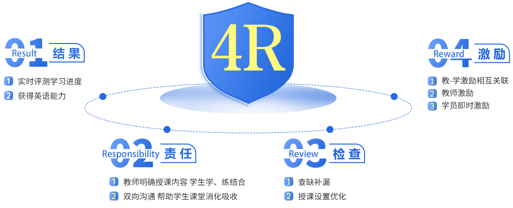 4R,代表着 Result (结果)、Responsibility (责任)、Review (检查)和 Reward (激励)。四者有机结合,形成“以结果为起点,又以结果为归 宿”的科学、实用。新航道将4R系统运用于个性化课堂,把复杂的问题简单化、简单的事情量化、量化的事情标准化,输出学员专属解决方案。